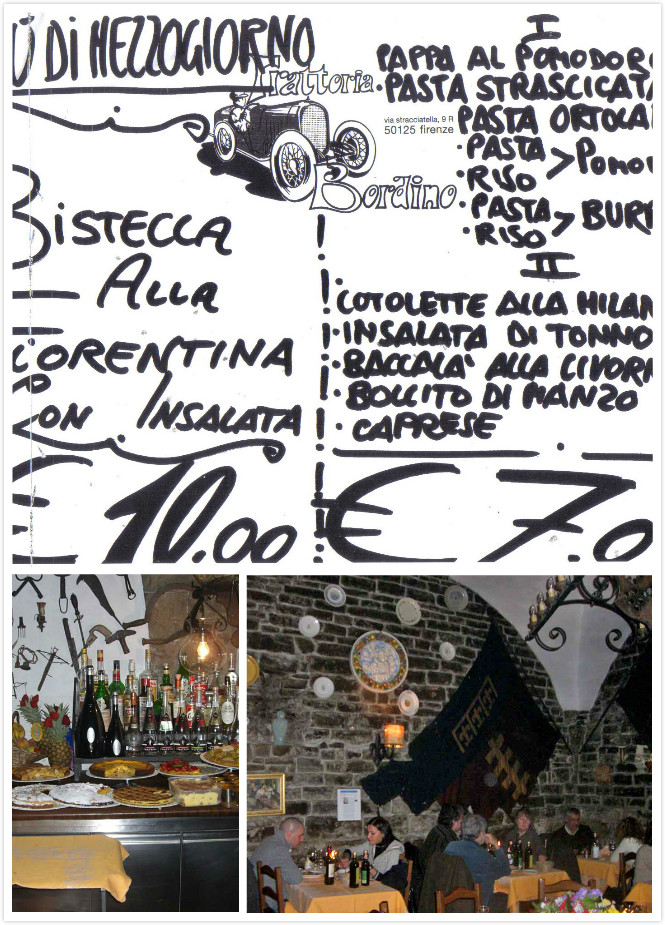 当然,再怎么酱油,好吃的总是不能省的。诸君,如果你也去佛罗伦萨,请一定要去这家餐馆:Trattoria Bordino , 也就是地图上右下角的牛排君(没错我画的是牛排来着)。这家小店位置有点隐蔽,虽然有Google地图我们还是不屈不挠地绕了好几圈才找到。而事实证明,这家店绝对是物超所值:装饰很有特色,服务很热情,最重要的是价廉物美(所以周围的顾客大都像是本地人)。大力推荐他家十块钱的牛排和甜点拼盘。以及由于二人专注于吃无心拍照,所以只好去他家主页找了几张照片充数。。