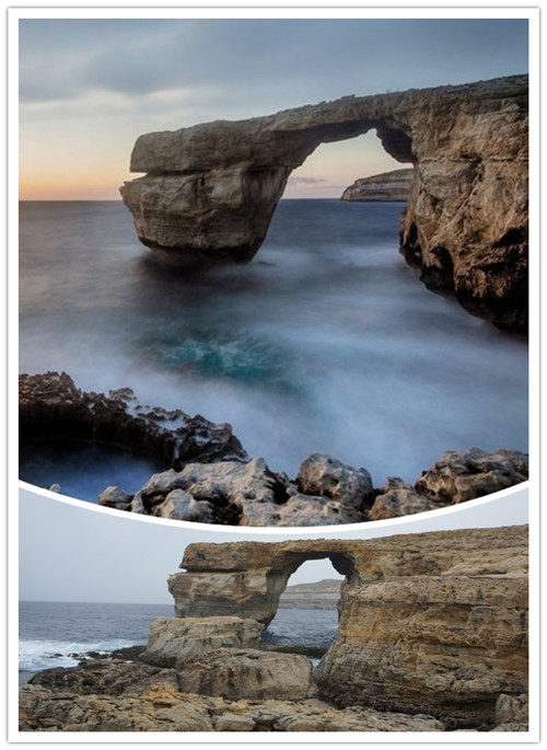 补充了能量,我们终于开始了最坑爹的旅程部分。传说中,马耳他的蓝窗是图中上半部分这样的。而等我们吭哧吭哧坐岛内巴士到了蓝窗的时候,天已经开始下蒙蒙细雨了。所以我们看到的蓝窗,是图中下半部分这样的。你能想象我们当时下了公车就想直接掉头上公车回去的心情么。。
