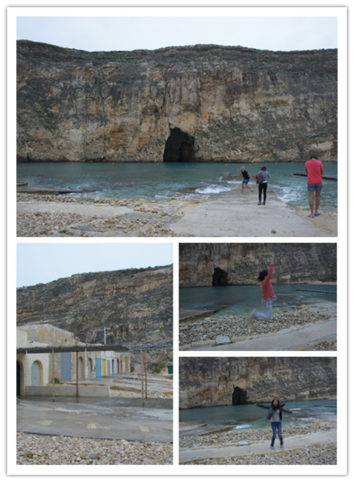 不管怎样,秉着“来都来了”的大无畏心态,二人来到了蓝窗的另一边。那是一片说不清卖点是岩洞还是湖还是仓库的地方,但是有一群欧洲年轻人不知为何在凄风苦雨里玩得很high。或许是受到了那群熊“孩子”的鼓舞,二人也振作精神拍下了一系列互黑照片,扬言要印成明信片寄给小伙伴独乐乐不如众乐乐。嘛,Gozo,你不给爷笑一个,爷就给你笑一个!